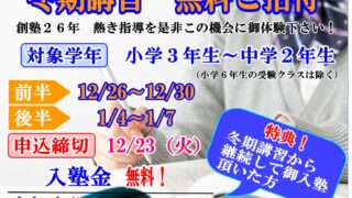 講習 2025冬期講習 冬期講習で学力UP!!子供たちの未来を預かる立場として共に成長し、どのような状況下であっても「成長を止めない」ことをお約束致します。人数に制限はございますが是非一度ご体験ください。電話:03-3785-8231メール:shougakusha... 2025.12.09 講習